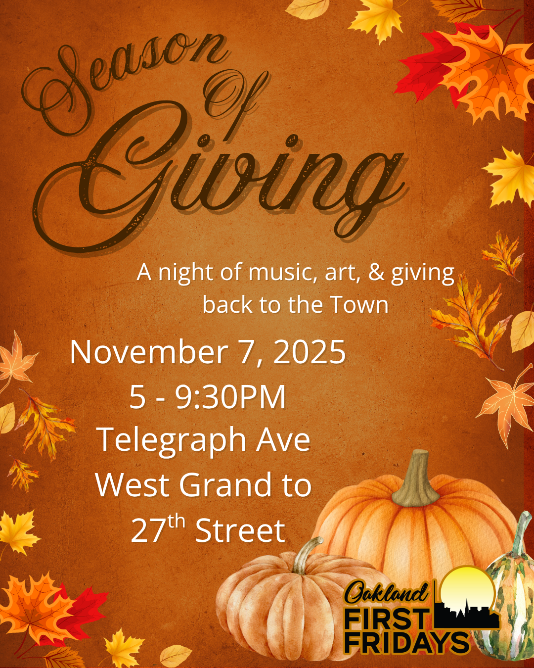 Sharing the Spirit of the Town is back this November, and it’s going to be bigger, brighter, and full of heart! Come celebrate generosity, community, and the power of giving back. Enjoy live music, dynamic performances, festive lights, and a vibrant marketplace filled with local vendors, artists, and businesses making a difference in Oakland. Whether you’re donating, volunteering, or simply soaking in the joyful vibes, this evening is all about spreading love, kindness, and unity throughout the Town!